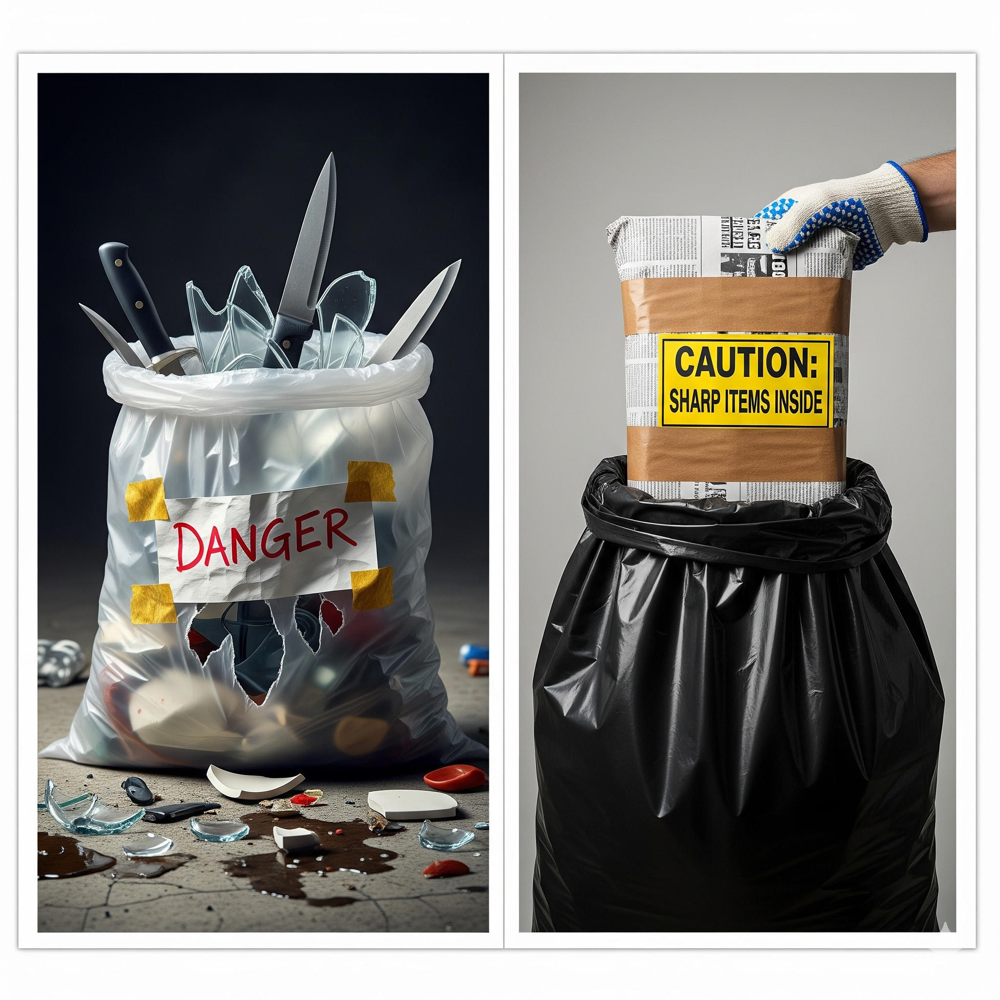 - '주의' 표시하기: 깨진 유리와 마찬가지로, 봉투 겉면에 "칼날 조심", "위험" 등의 경고 문구를 크게 써서 붙입니다.